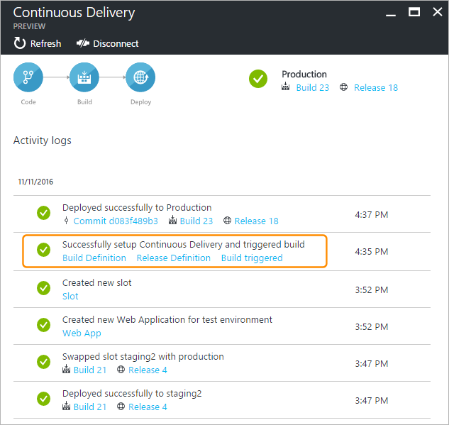 - Azure Continuous Delivery creates a build and a release definition in the Team Services account you specified, together with a service endpoint to connect to Azure.