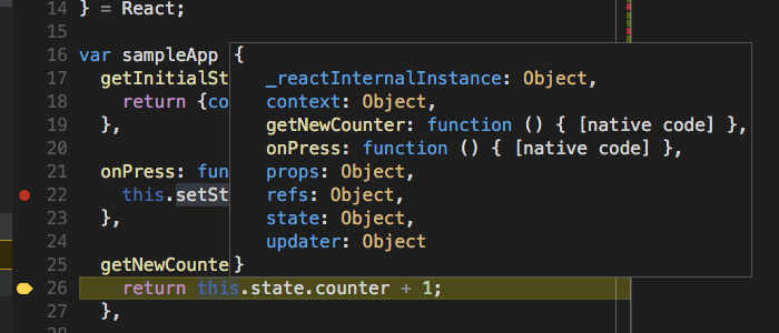 - Syntax highlighting and autocomplete capabilities for both JavaScript statements and JSX snippets in the source files.