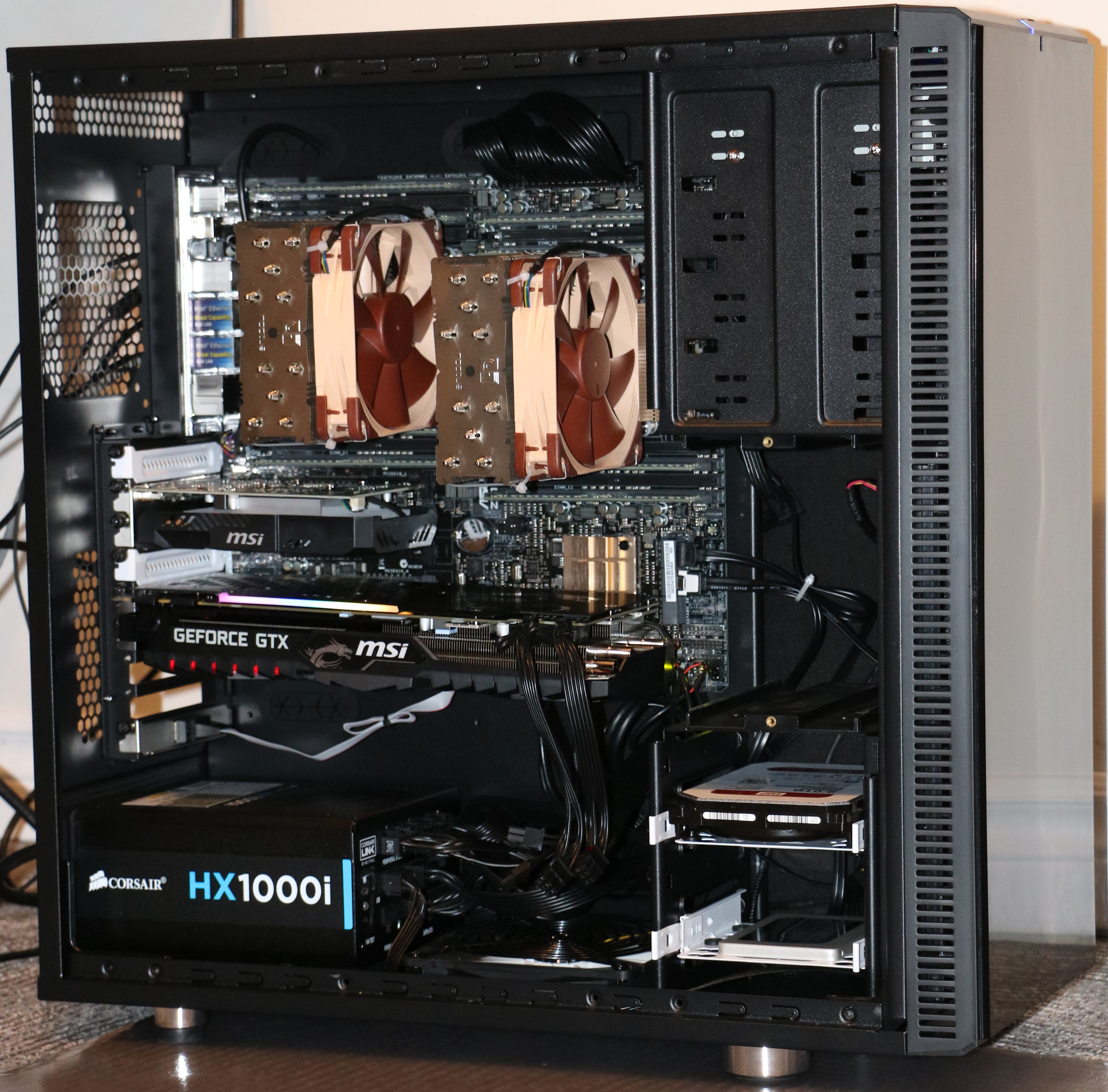 The case was another big headache. It's really hard to get useful data since the amount of noise depends on what's in the case more than on the case itself. After all, cases don't cause noise, they attenuate it. In the end, I went with the Fractal Design Define XL R2, mostly due to the overall good reviews and the sound absorbing material in the panels. Again, I can't compare it to other cases, but it seems to be dampening the noise from the CPU coolers pretty effectively.